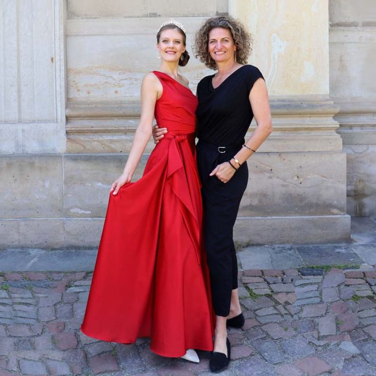 Die First Lady von Sachsen ist Schirmherrin der Debütanten und trägt zum Jubiläum des SemperOpernballs ein Corsagenkleid aus coralfarbener, schwerer Seide. Das Oberteil mit schwunghaftes Ausschnitt wird zur Taille hin asymethrisch drappiert und läuft in einen weit fallenden Rock. Das Taillenband mit seitlicher Brosche betont die elegante Silhouette.